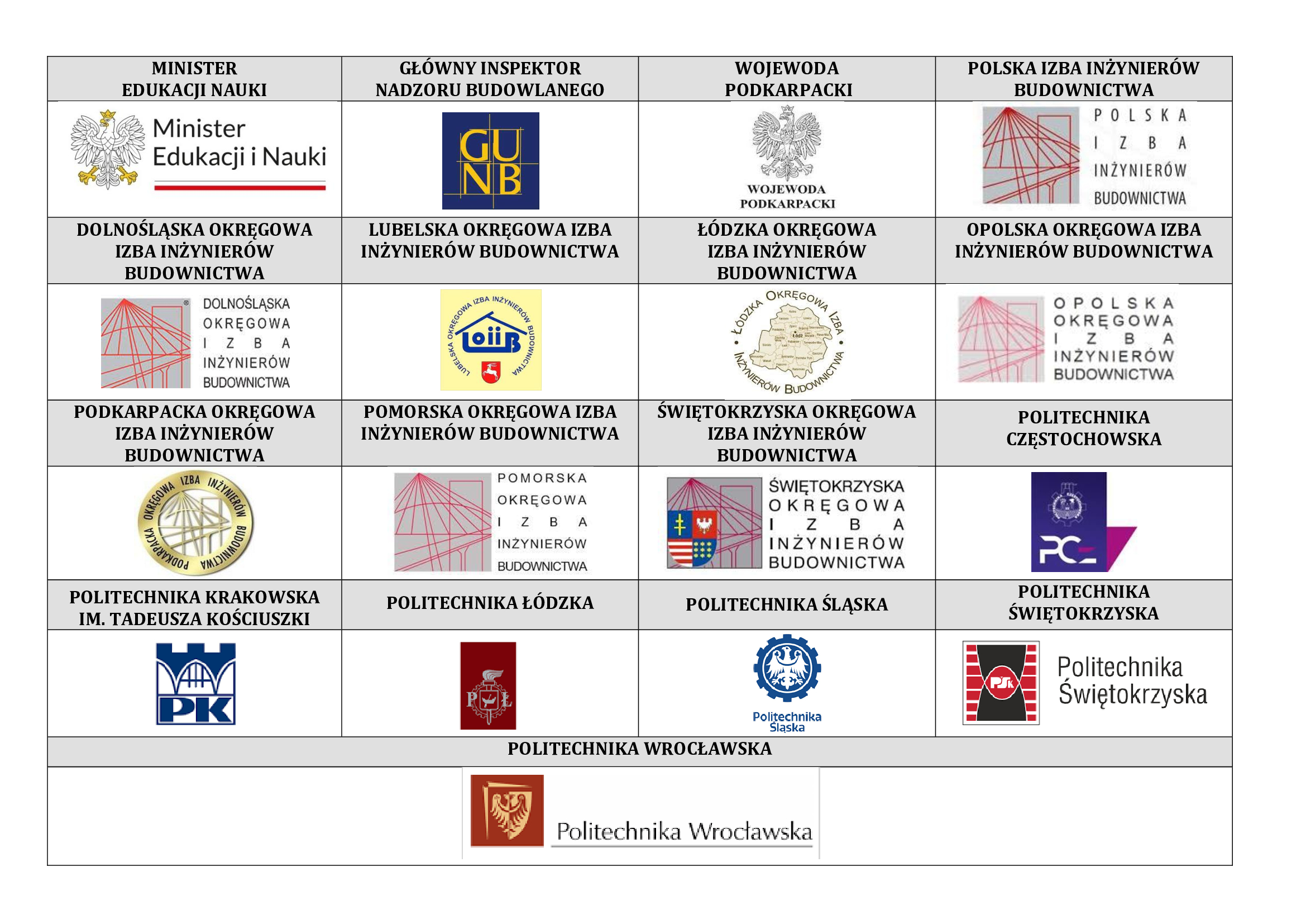 Aktualnie patronat honorowy nad olimpiadą objęło 17 podmiotów: Minister Edukacji i Nauki, Główny Inspektor Nadzoru Budowlanego, Wojewoda Podkarpacki, Polska Izba Inżynierów Budownictwa oraz izby okręgowe: Dolnośląska, Lubelska, Łódzka, Opolska, Podkarpacka, Pomorska, Świętokrzyska oraz Politechniki: Częstochowska, Łódzka, Krakowska, Śląska, Świętokrzyska i Wrocławska.